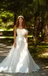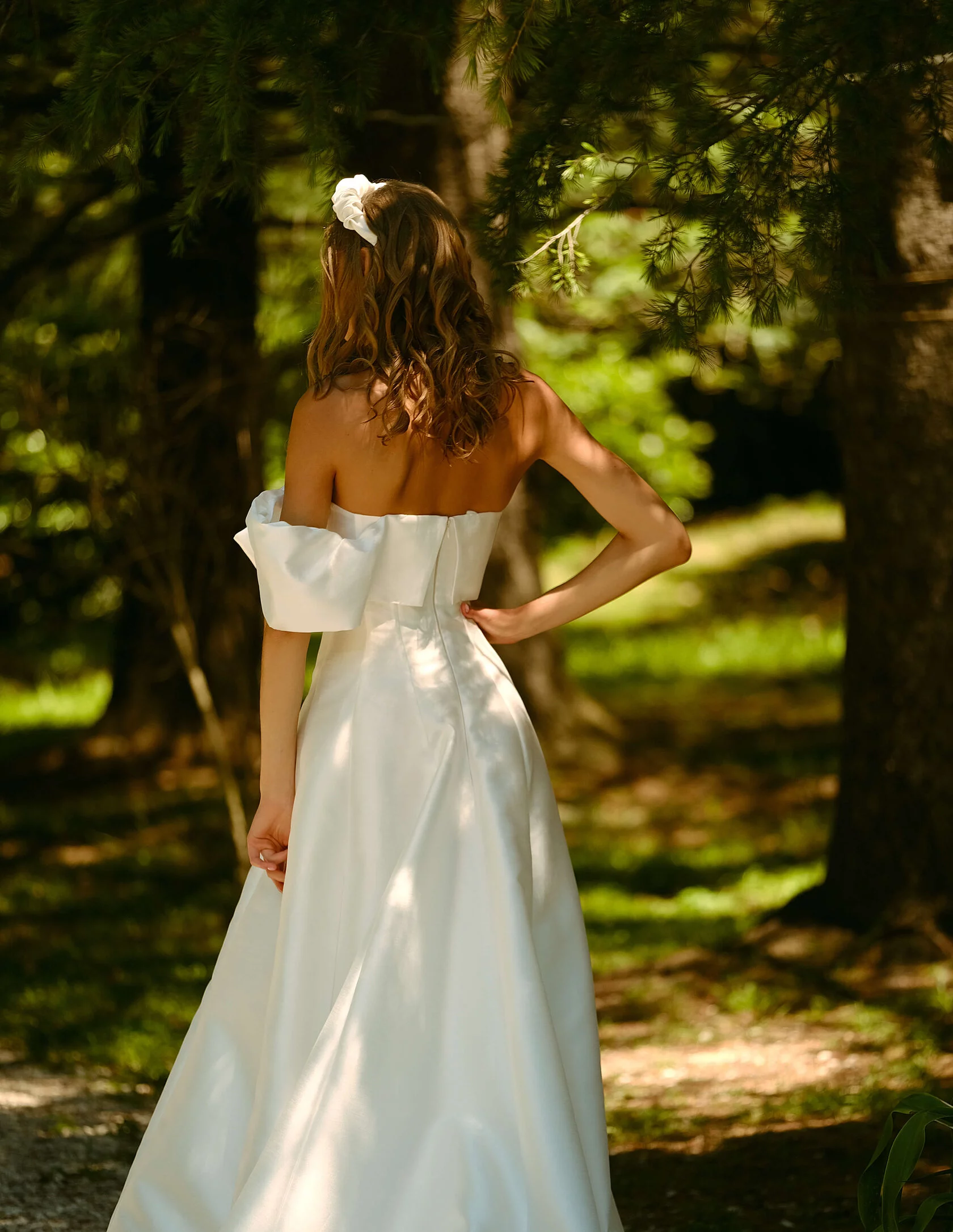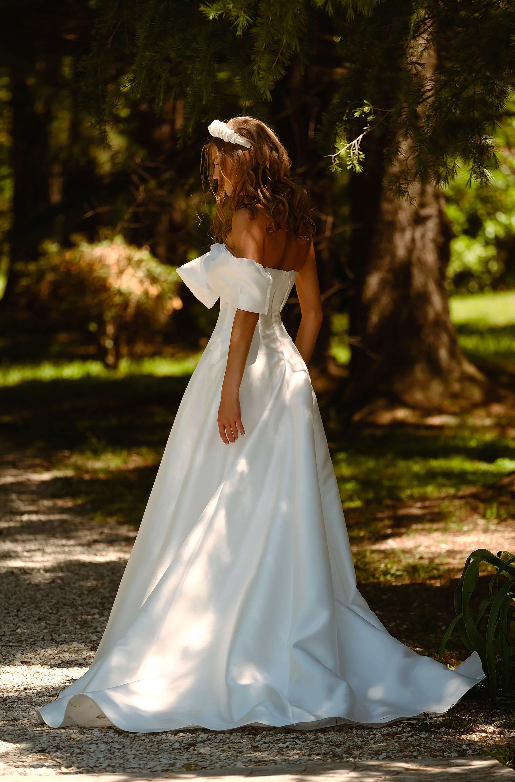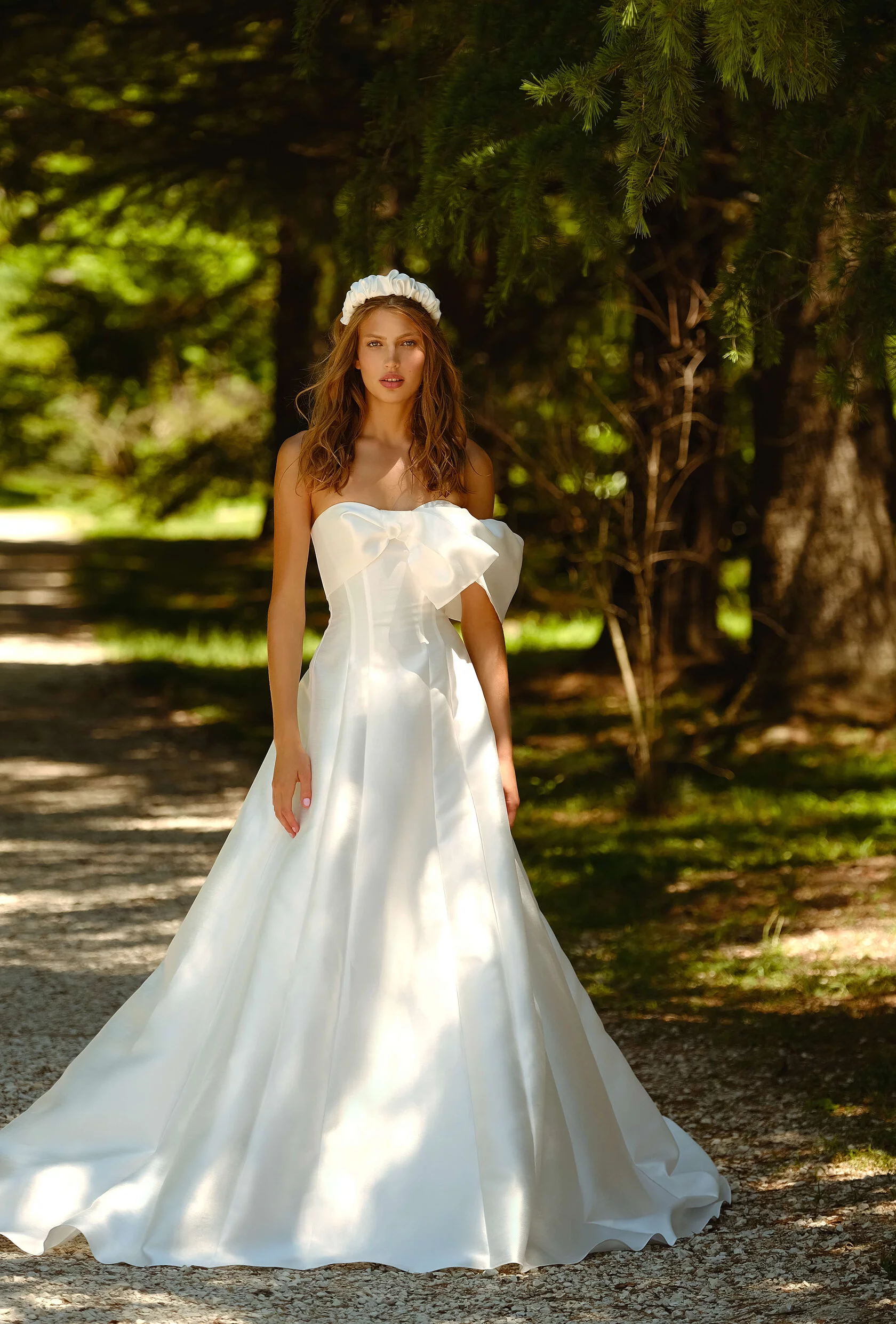 Princess wedding gown. The front of the dress has a bow with a strap on one shoulder. The feature of the dress is decorative seams along the skirt. The dress skirt has a train.