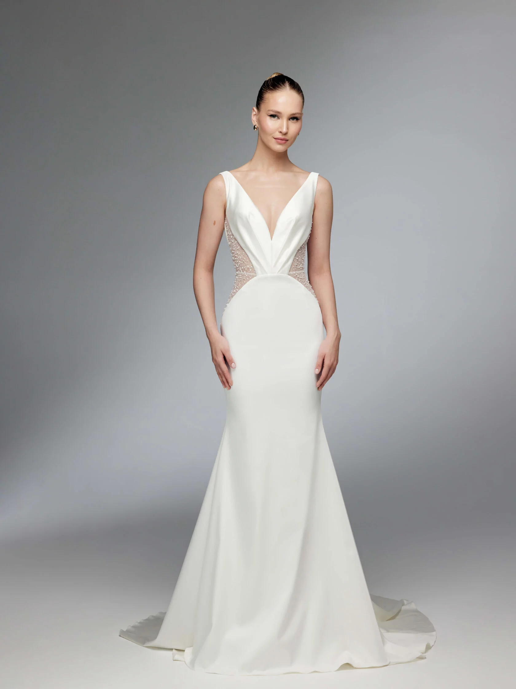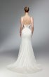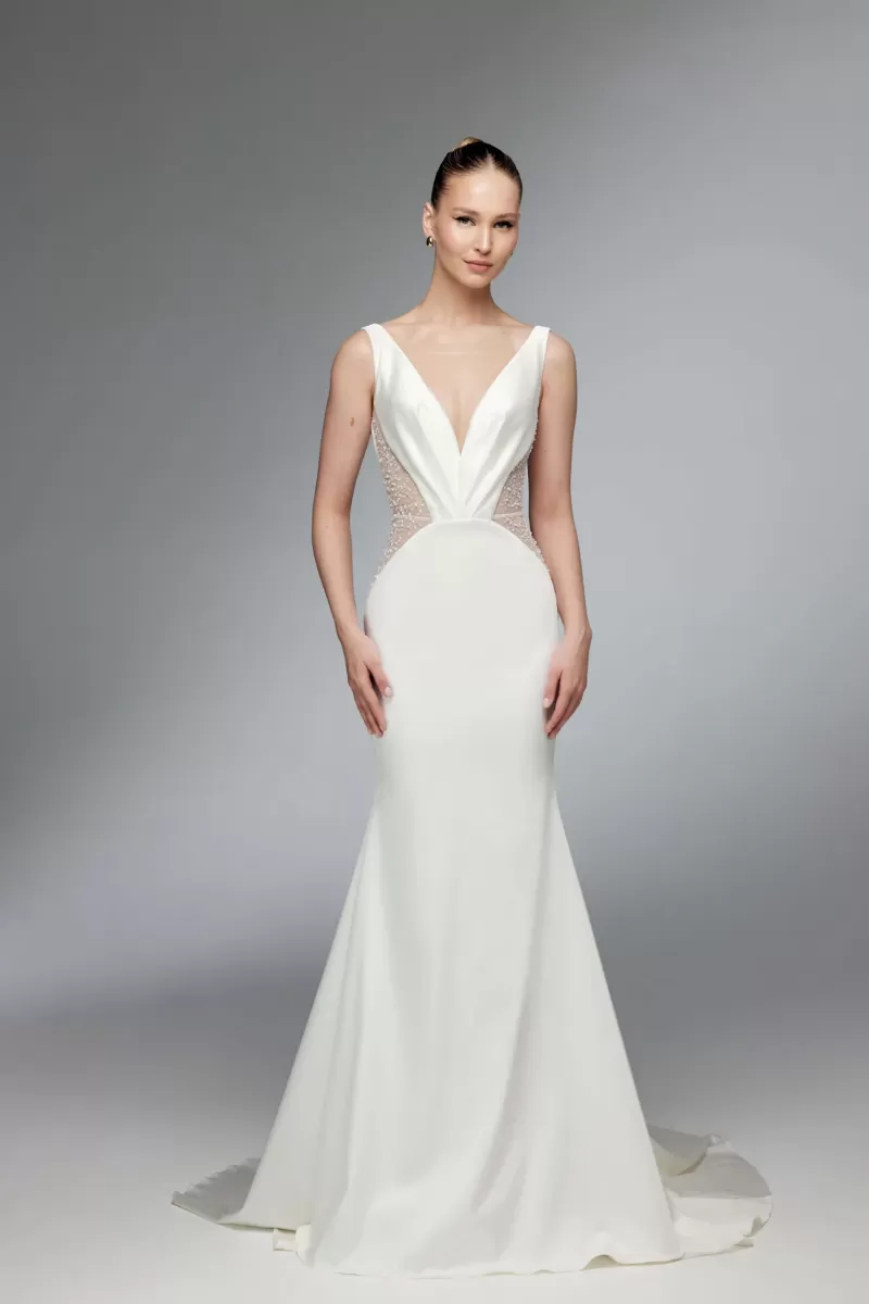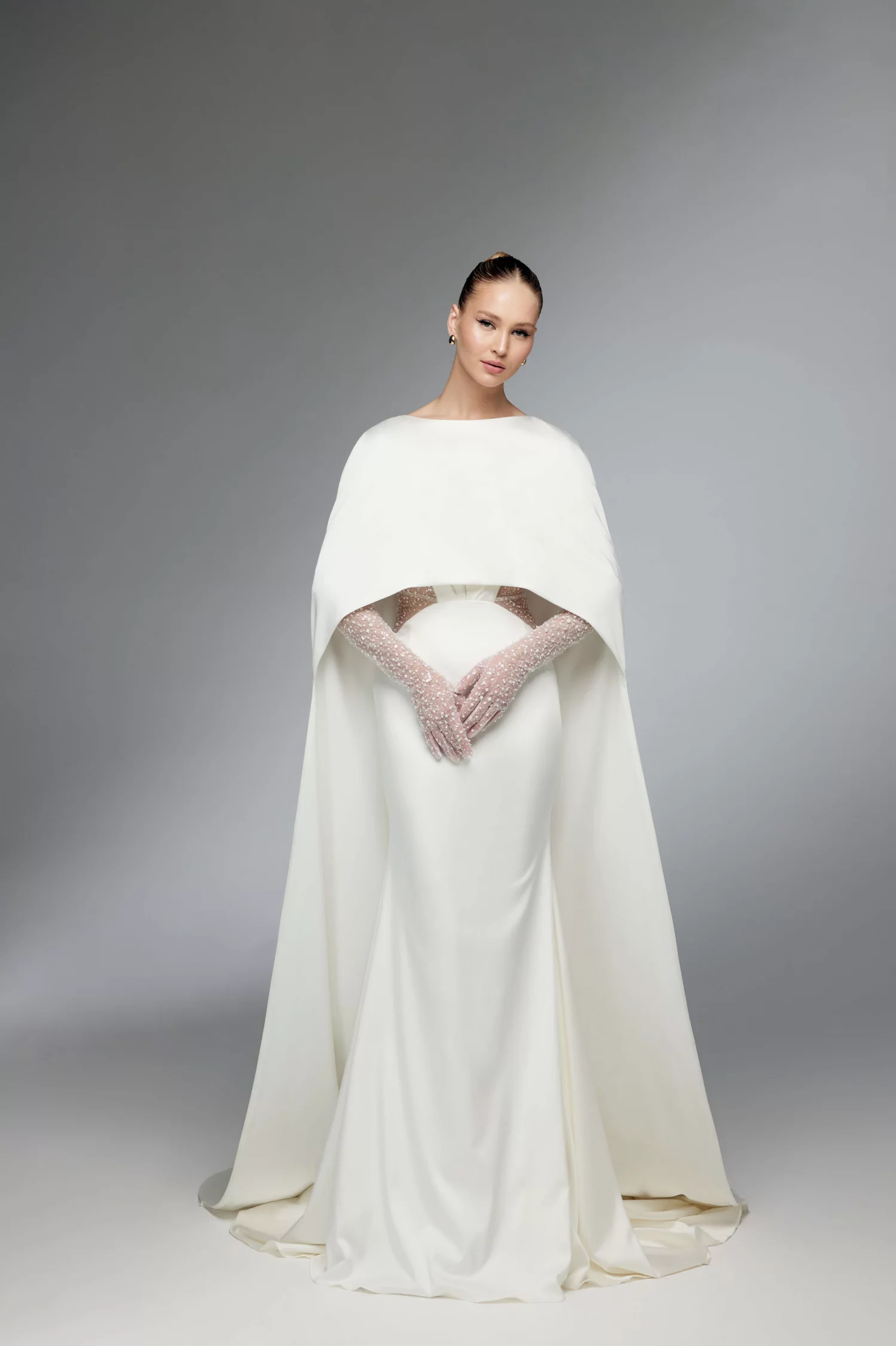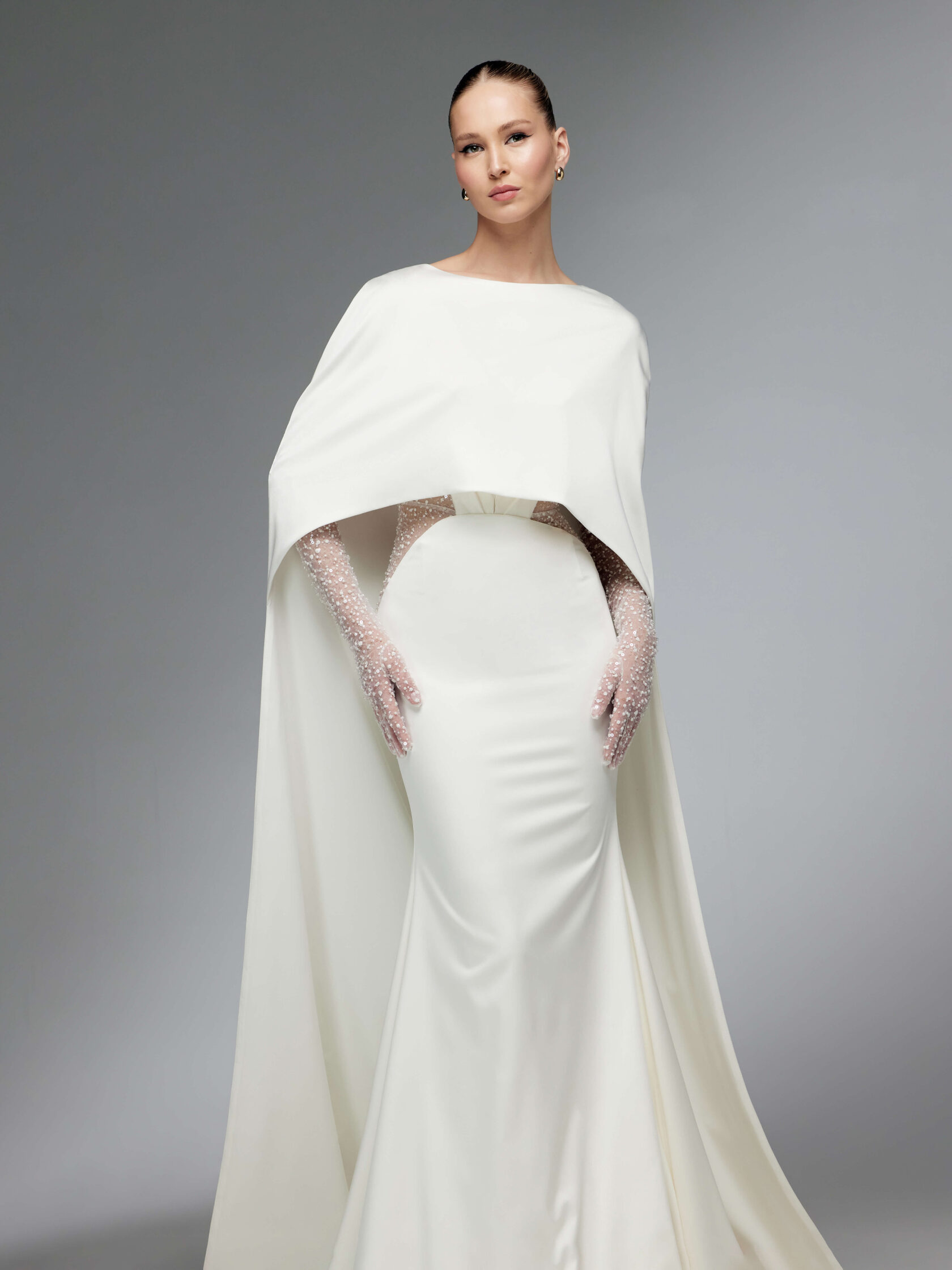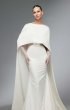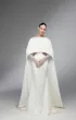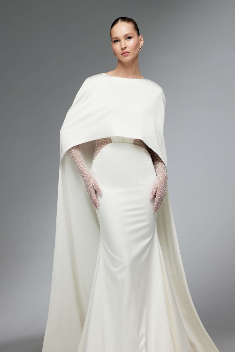 Fitted wedding gown comes with a long cape and gloves. The V-shaped gown has transparent sides and drapery on the corset.