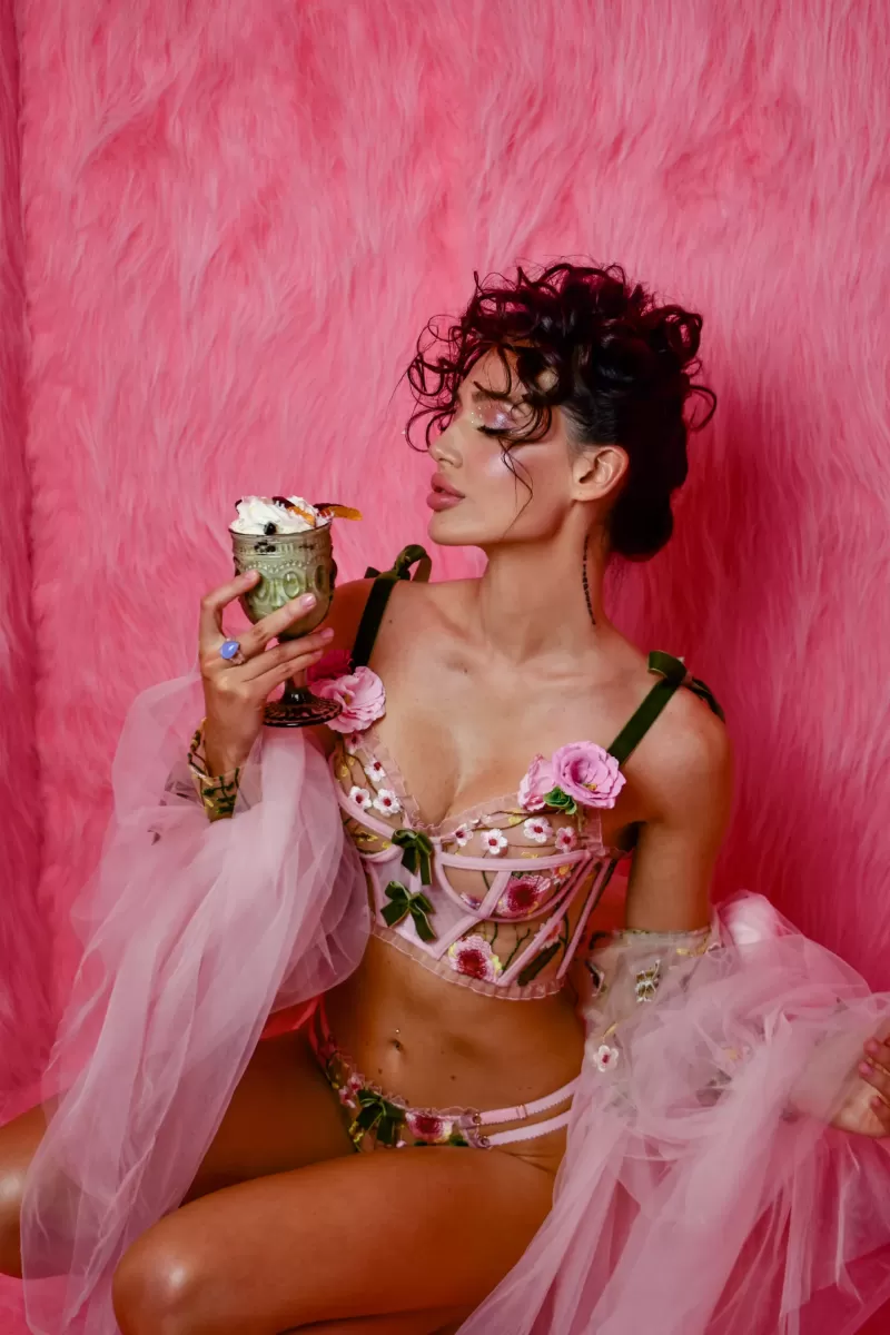 Colorful floral set has unusual decorations in the form of flowers and velvet bows. The set consists of the bodice with removable straps and panties.