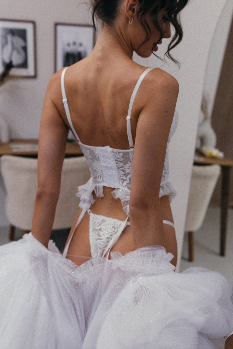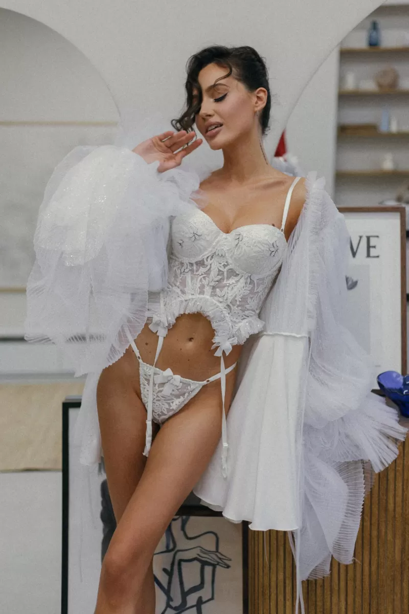 The brand new look of the corset bodice with access to the stocking holders gives the look a special charm. The set also includes thong panties.