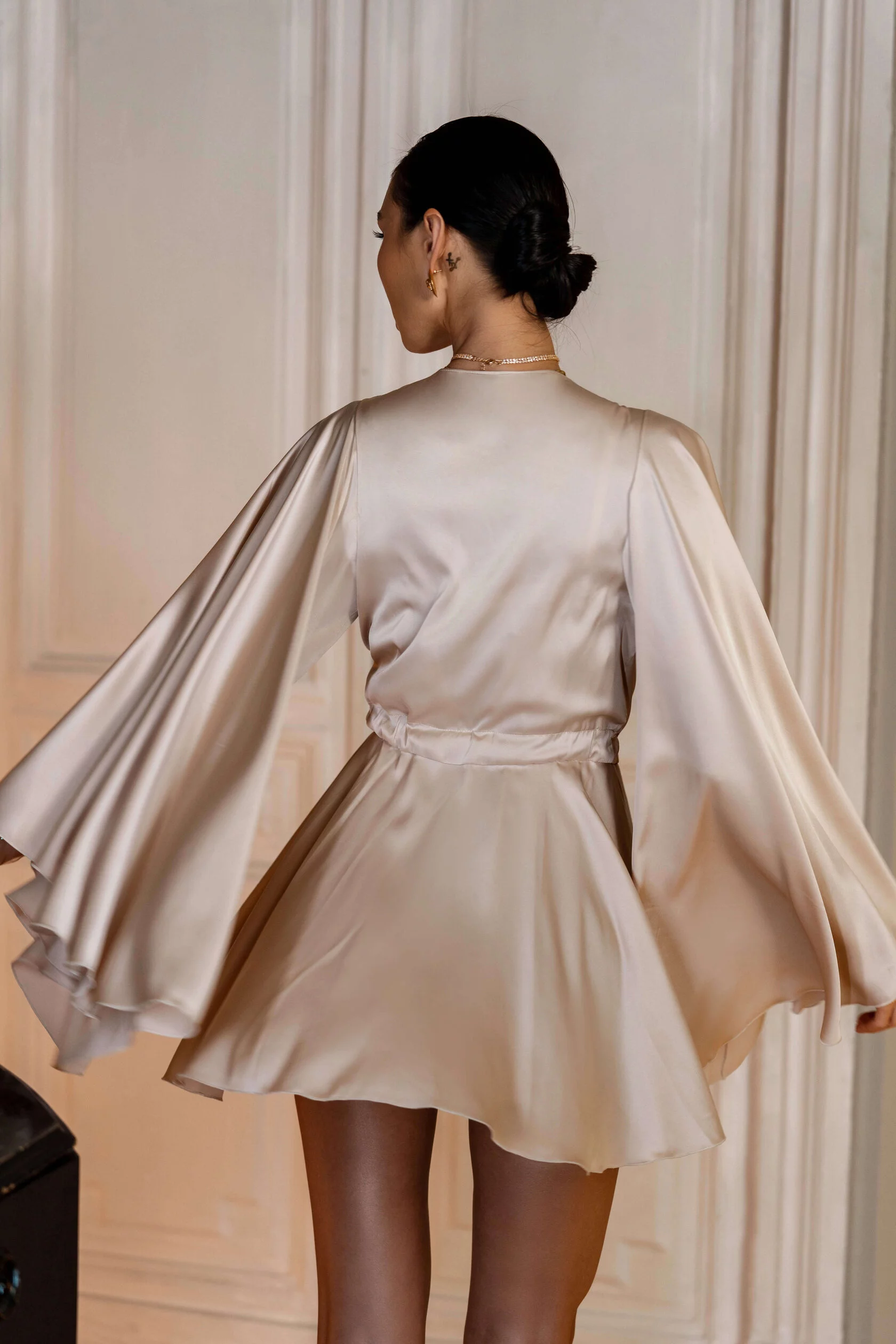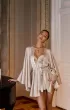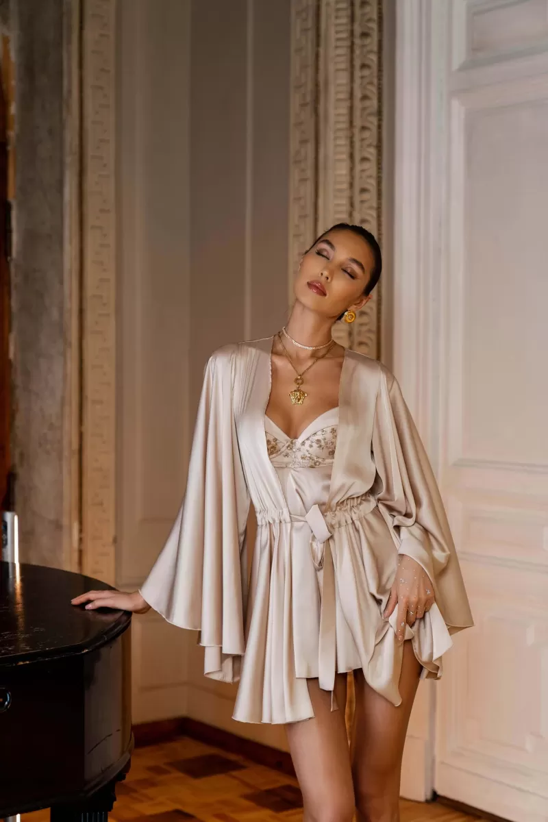 Short satin Berry peignoir, seamed at the waist with a flared skirt. The product is tied with a bow at the front. The flared long sleeves add special lightness to the peignoir.