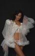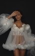 Airy and translucent bridal peignoir. Mini length peignoir with voluminous sleeves. Inside the sleeves are decorative removable lush peonies.