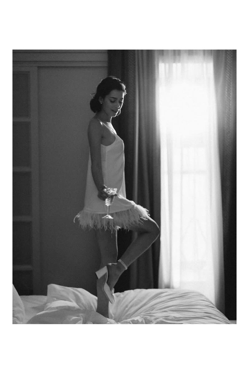 Wedding shirt has thin straps and detachable feather tape. Midi wedding peignoir Kita with a wide belt. The bottom of the sleeves is decorated with a detachable feather tape.