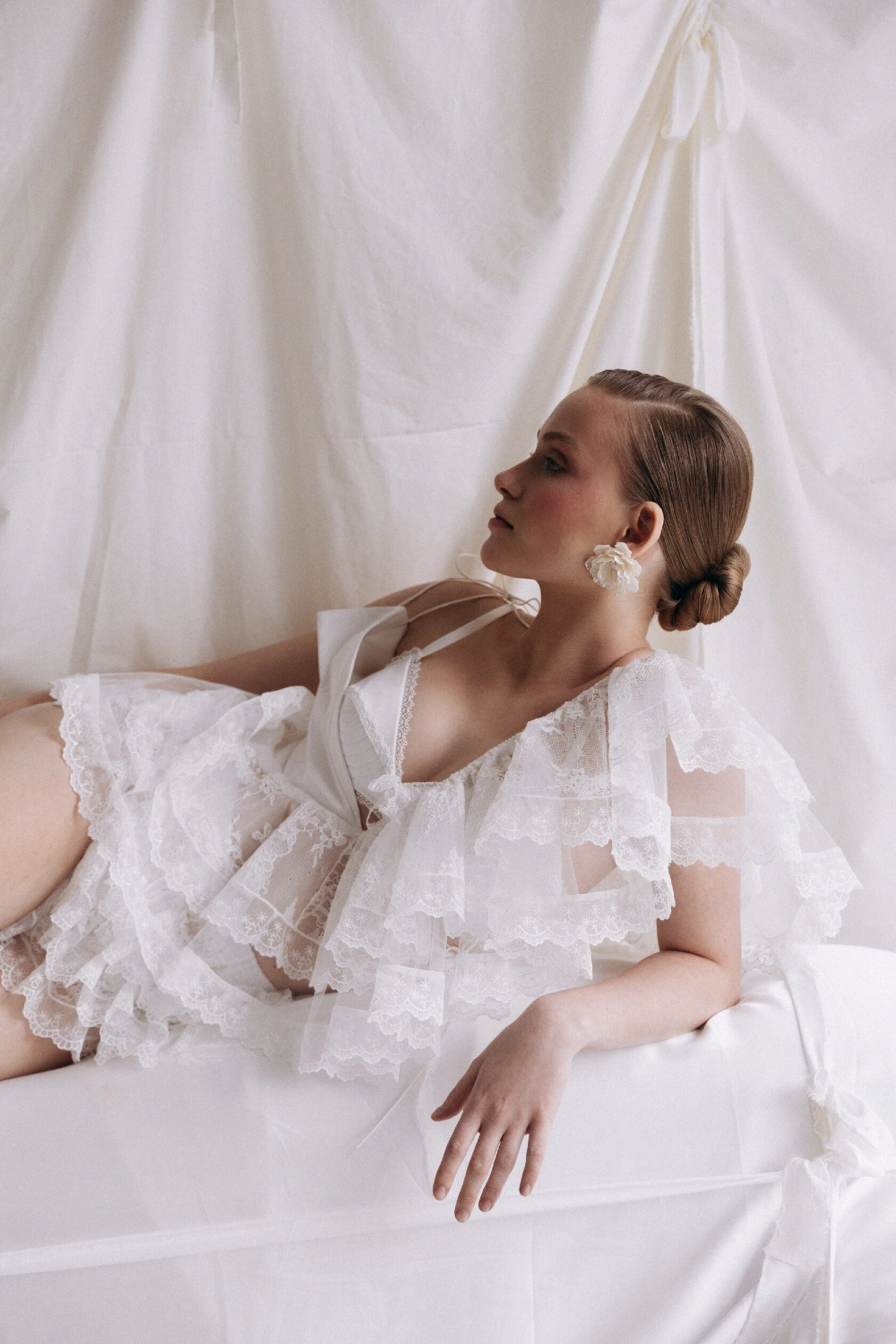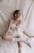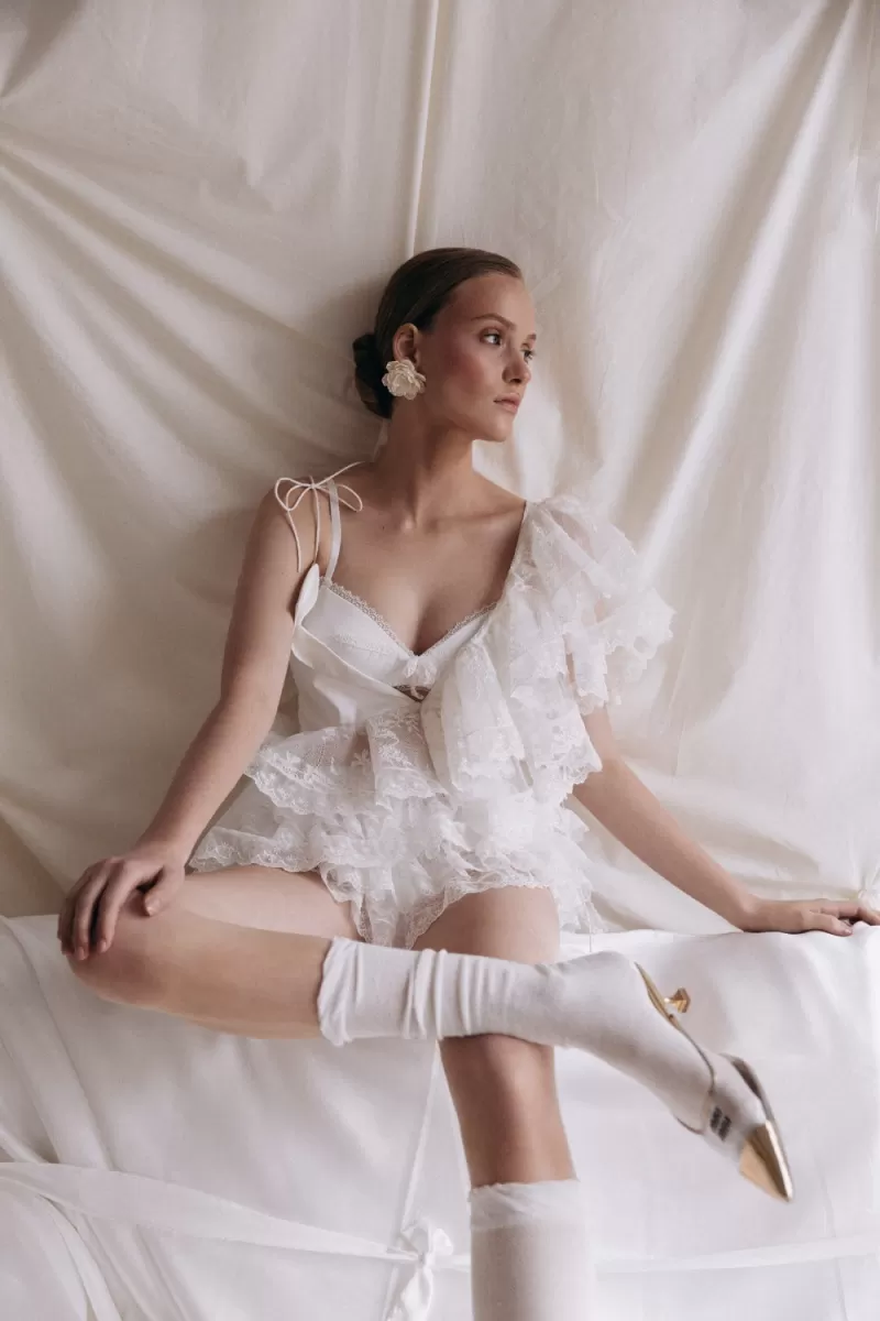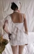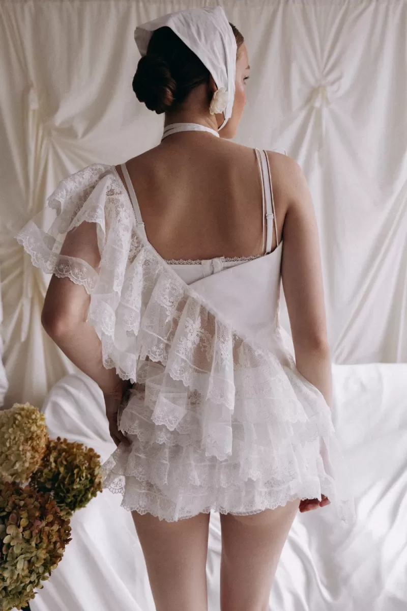 Set of top and shorts. Asymmetrical top, which is tied on one shoulder with a drawstring. The second part of the top is represented by flounces, moving from the right shoulder to the left side. Mini-shorts made of lace, drapery on the shorts add a romantic mood to the image.