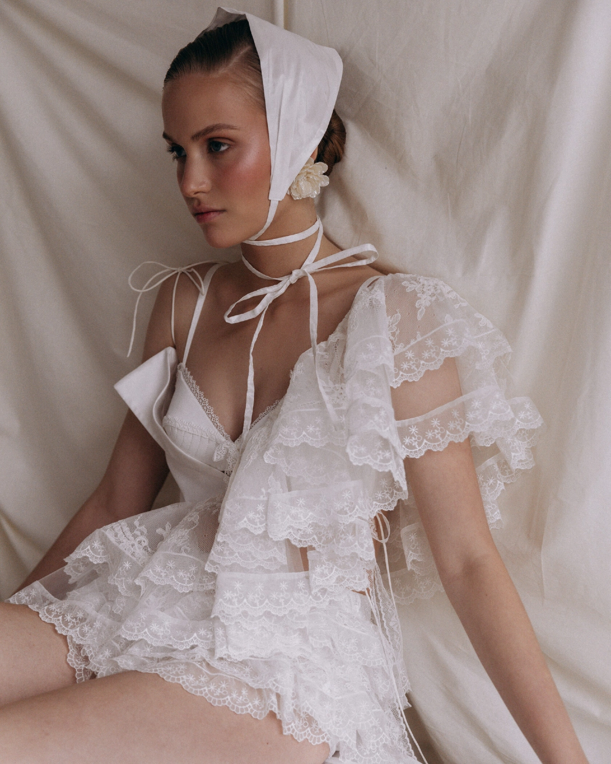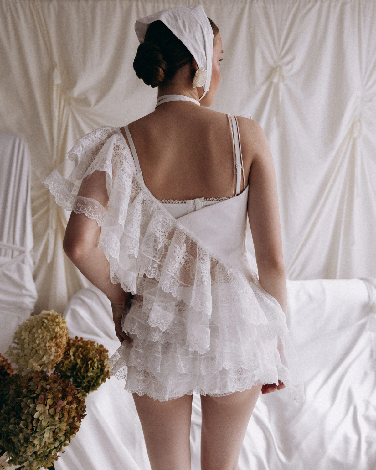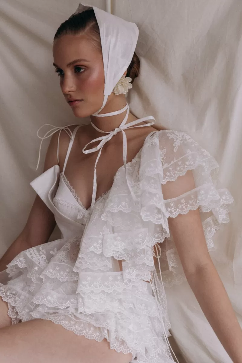 Set of top and shorts. Asymmetrical top, which is tied on one shoulder with a drawstring. The second part of the top is represented by flounces, moving from the right shoulder to the left side. Mini-shorts made of lace, drapery on the shorts add a romantic mood to the image.