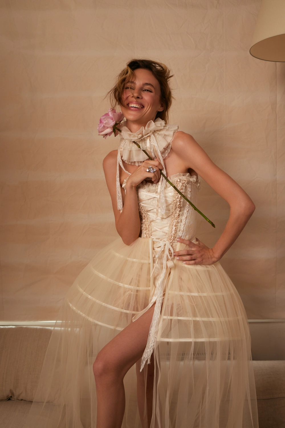 The exquisite corset made of floral jacquard perfectly accentuates the figure. Ruffle decor and long ribbon bows add pure femininity to the look. The ultra-fluffy mini skirt is covered in romantic little bows. A detachable rococo-style peplum completes the set, and a lace choker with a tiny bow finishes the outfit.