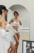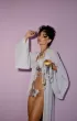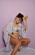 Lavender midi length peignoir for the bride's morning with asymmetrical drapery.