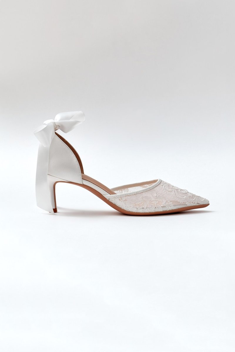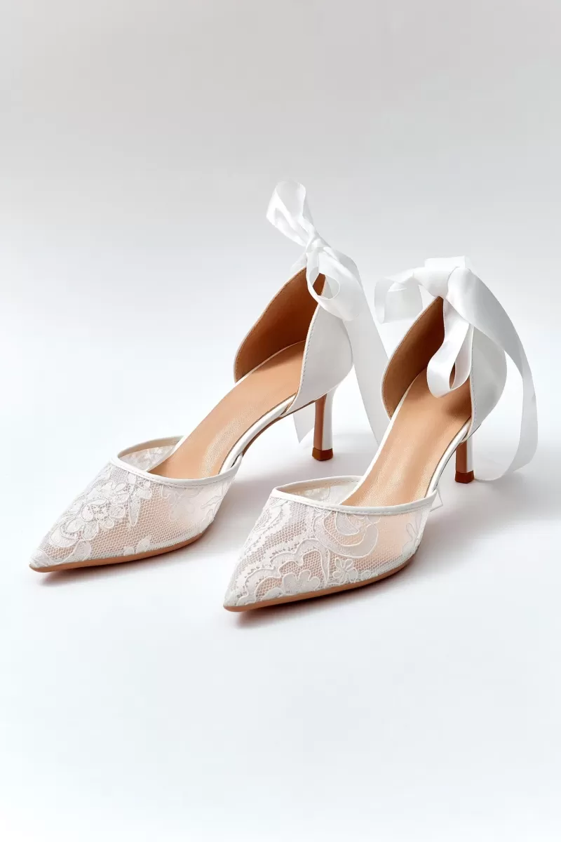Milky low-heeled shoes. A decorative satin ribbon tie is added to the heel, covered with satin fabric. The toe of the shoes is made of lace with decorative thread.