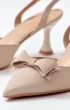 This model of shoes is available in two colors: powder and cream. Semi-open shoes are made of artificial leather. The leg is secured with a strap at the heel. The nose is decorated with a leather bow. The heel shape is glass.