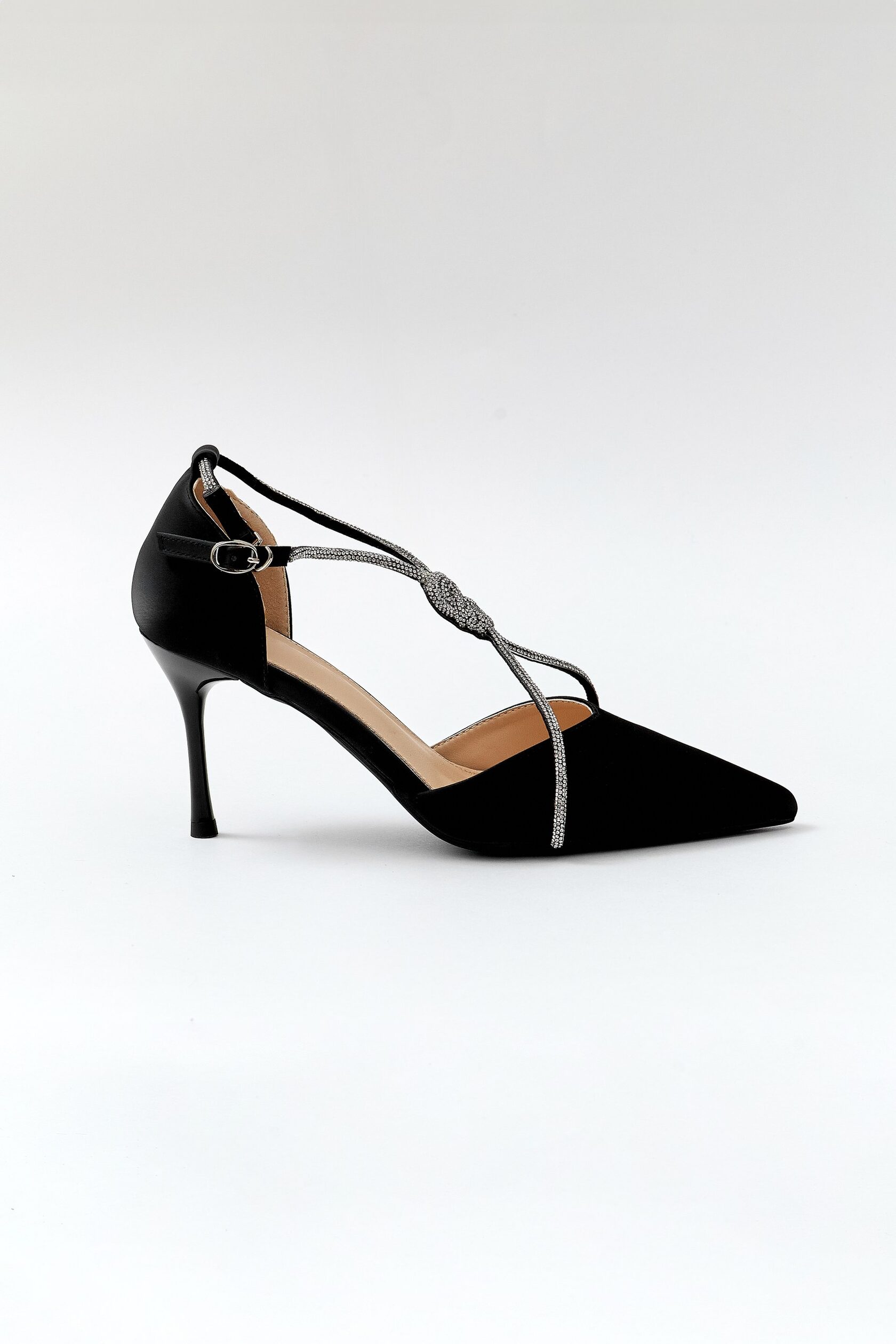 Shoes with X-shaped decoration on the instep made of small crystals. Available in two colors: powder and black. For additional support of the foot, there is a strap on the heel that is adjustable with a buckle. The upper is made of satin fabric, the heel is varnished.