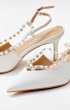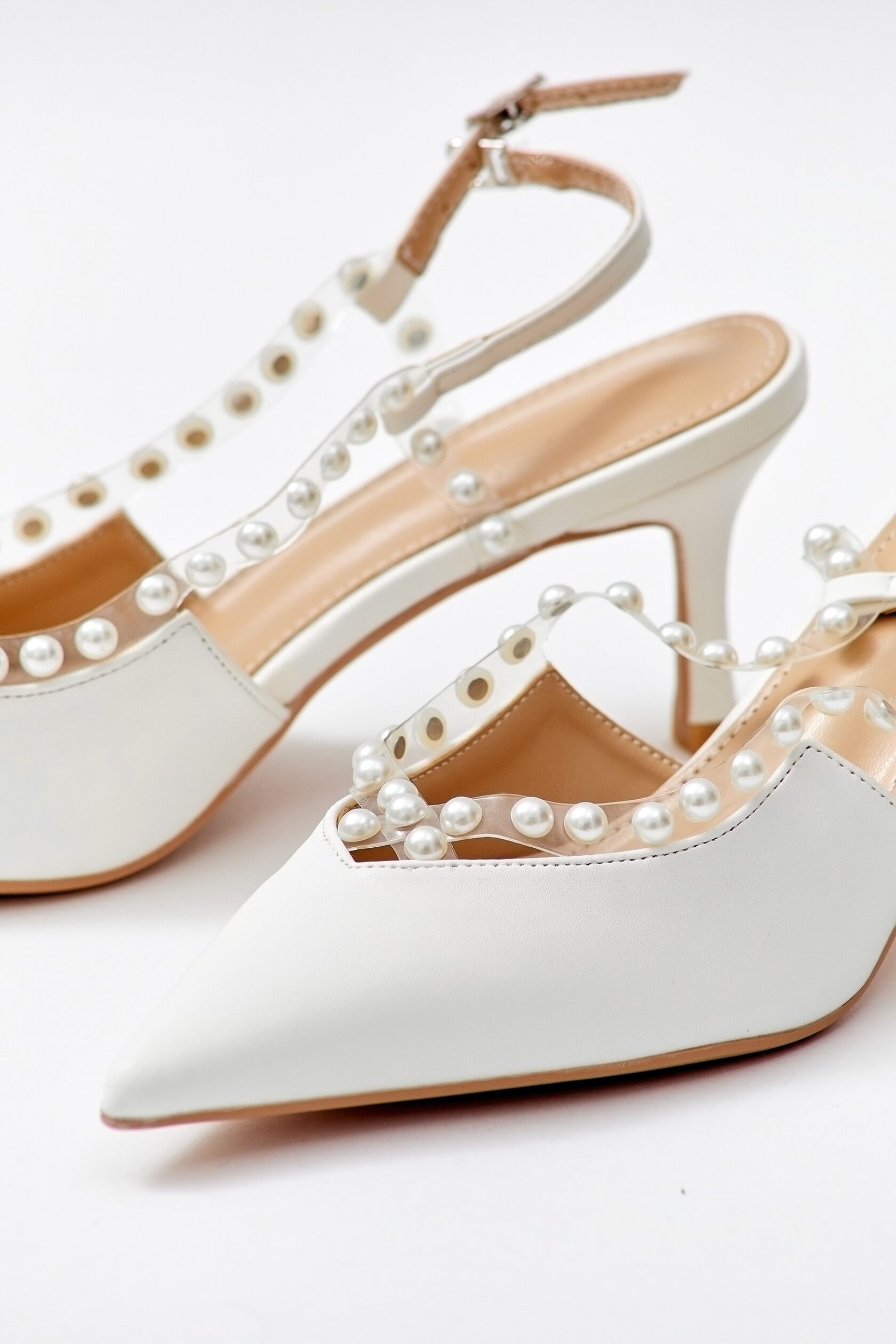 Semi-open shoes with a decorative silicone ribbon, which is decorated with pearls. The upper of the shoes is made of milky artificial leather. On the heel there is a strap adjustable with a buckle, which additionally secures the bride’s foot.