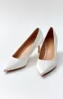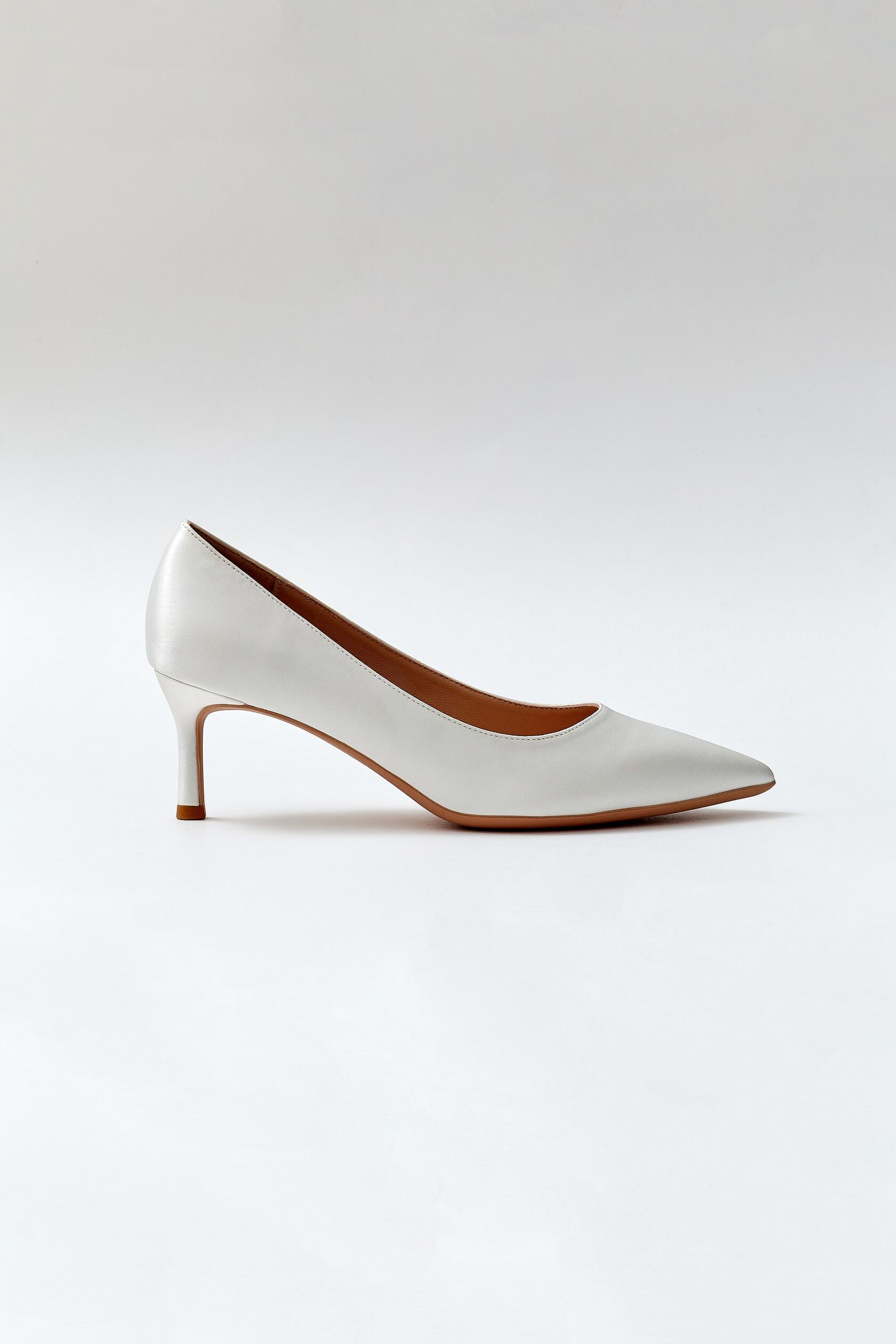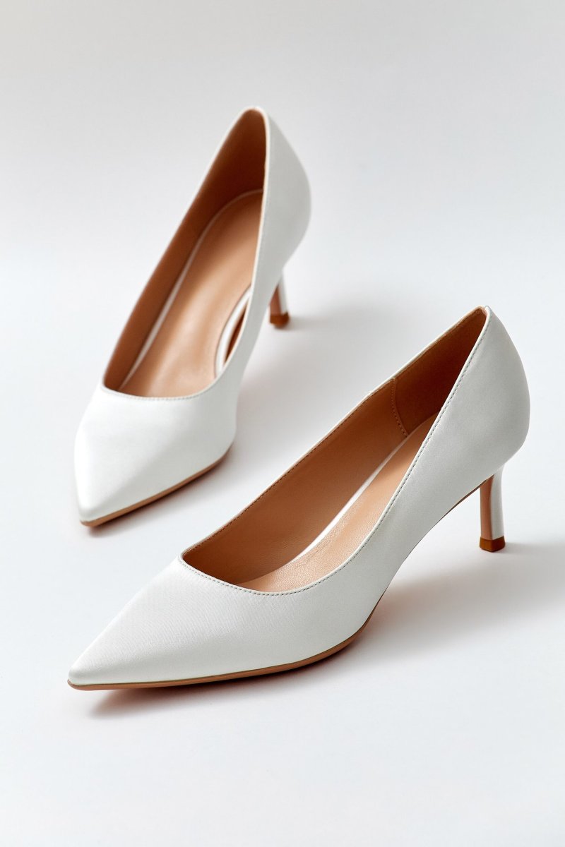 Classic pumps in milky color. The top of this model is made of satin fabric. The inside of the shoes is made of leather.