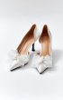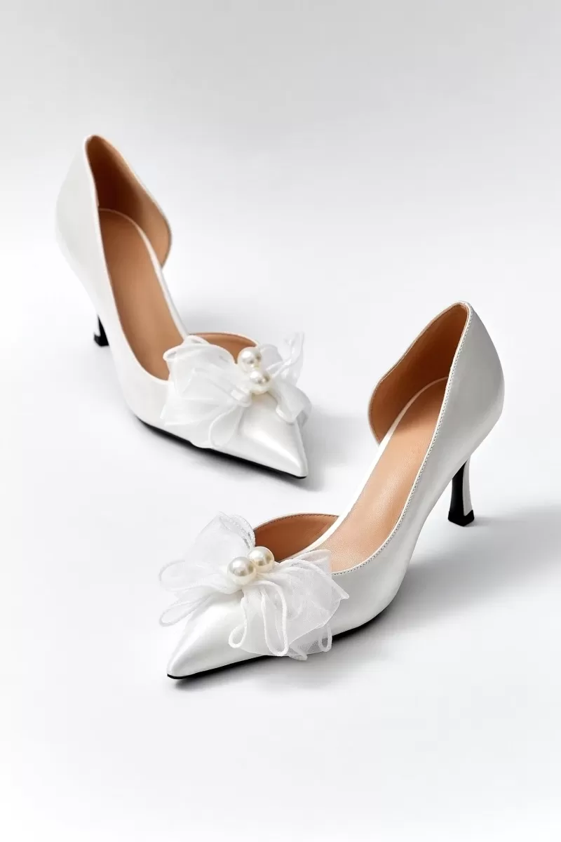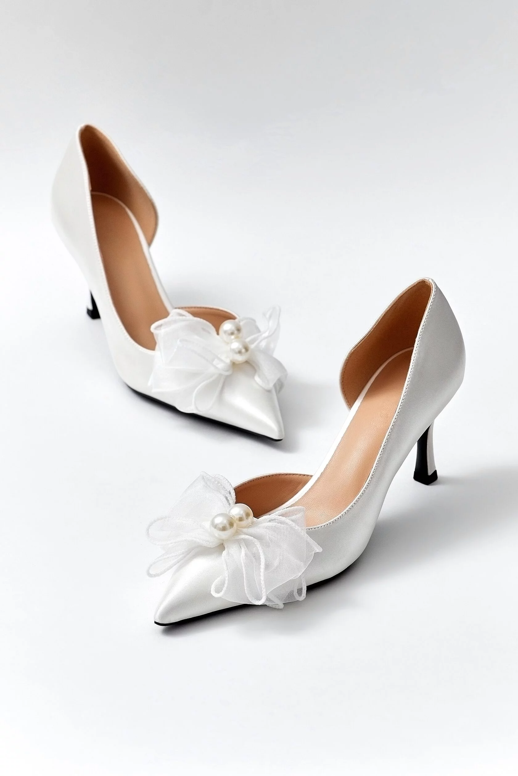 Pumps in milky color with a beaded decorative organza bow on the nose. The top of the shoes is made of satin, the inside is made of leather.