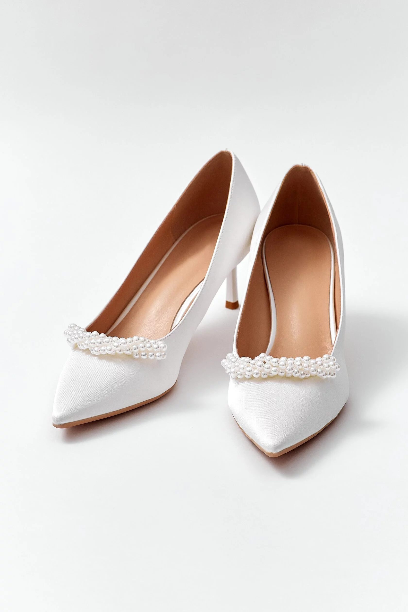 Classic milky pumps. The top is made of satin. This model is decorated with strings of pearls. Lacquered heel. The inside of the heel is additionally covered with fabric.