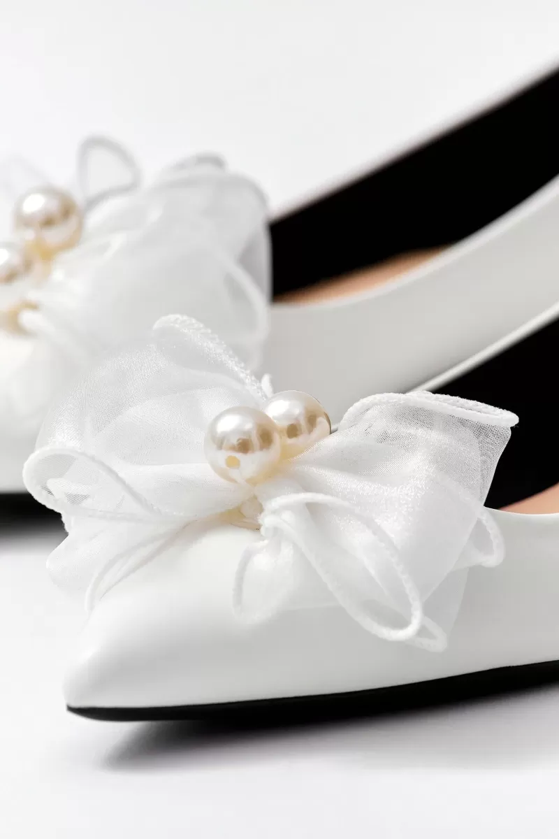 Ballet flats in milky color. The toe is decorated with an organza bow. In the center of the bow are two large pearls. The inside of the shoes are made of leather, the heel is additionally covered with fabric. The heel is framed with a gold mirror edge.