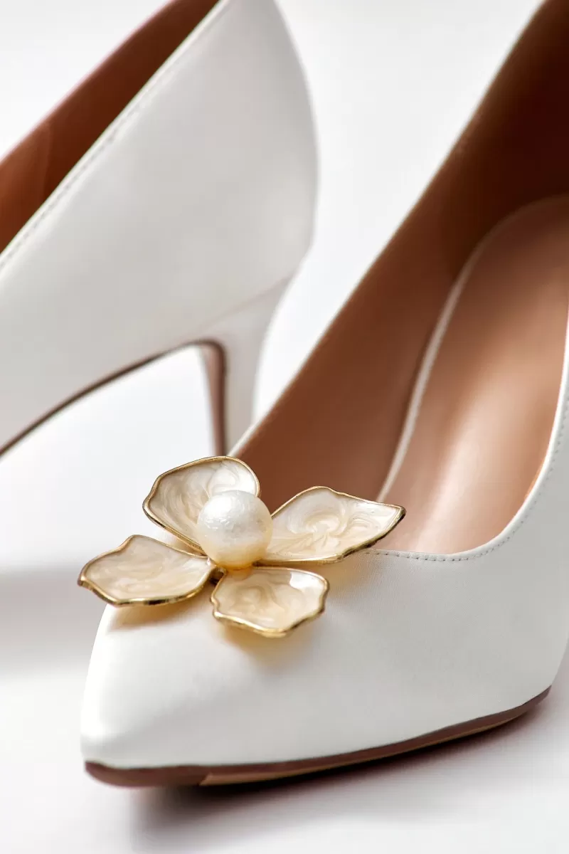 Classic satin pumps in milky color. The nose of this model is decorated with a mother-of-pearl flower with a pearl in the center.