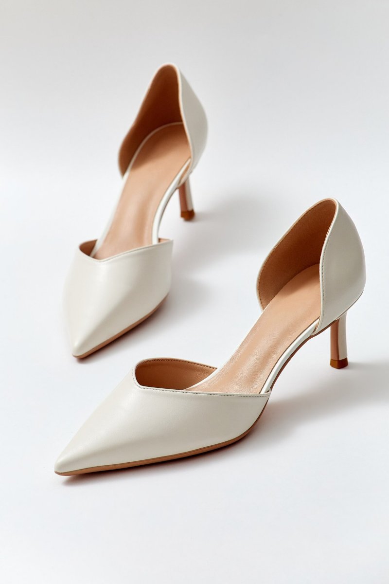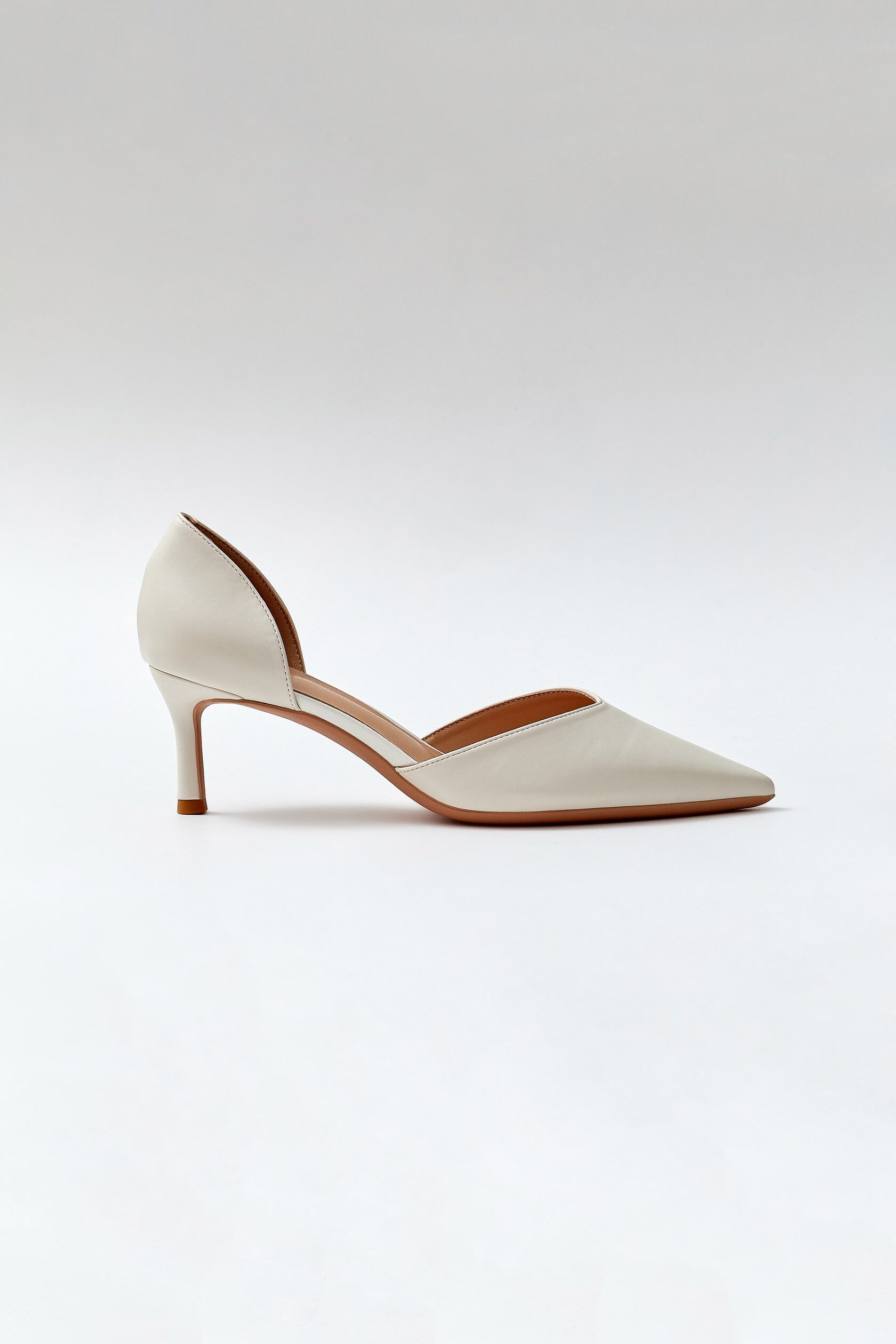Classic semi-open pumps. Can be made of milky leather or powder or milk satin. The heel is additionally covered with fabric.